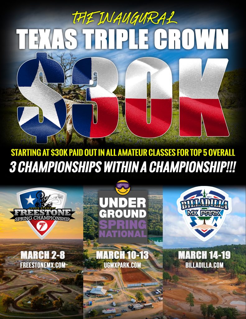 The Inaugural Texas Triple Crown. Three Championships within a Championship. Seven Mx JS7 Spring Championship Presented by Tamer, Underground Spring National, and Billa Dilla Spring National. Starting at $30k paid out to all amateur classes. Triple Crown Championship Trophies will be awarded at the final round!